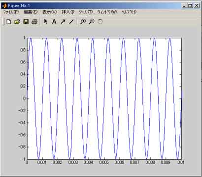 function sintest % % 純音の作成 % サンプリング周波数:22050Hz % 1秒間、1000Hz % % fs=22050; t=[0:1/fs:1]; f=1000; y=sin(2*pi*f*t); soundsc(y,fs); plot(t,y); axis([0 0.01 -1 1]); % 図の描画範囲の指定 |